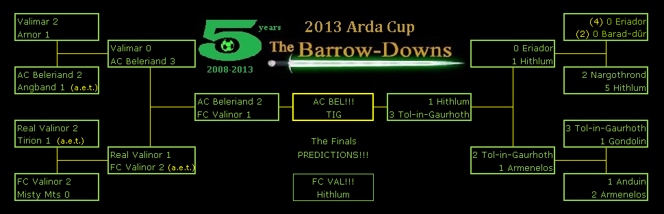 Predictions though... Tol-in-Gaurhoth defeats AC Beleriand FC Valinor defeats Hithlum. |