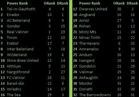 http://img.photobucket.com/albums/v7...e.jpg~original The Power Ranking is based on the aggregate of offensive and defensive ranking--the lower the aggregate, the higher the rank. Ties are broken by a) win-draw-loss-record; b) goal differential; and c) goals scored. The offensive ranking is based on the goals scored throughout the friendly matches. Ties are broken by a) greater number of shots made on target; and b) greater number of shots made. The defensive ranking is based on the goals allowed throughout the friendly matches. Ties are broken by a) least number of shots allowed on target; and b) least amount of shots allowed. Please note that the above ranking is based on the two rounds of friendly matches played by the teams, and does not reflect actual tournament performance. Top Individual Performers: GOALS + ASSISTS 3+0 Eärendil (The Havens) Smaug (Erebor) Mardil (Minas Tirith) 2+1 Maedhros (Inter Beleriand) Gandalf (Shire-Bree United) Eldacar (Gondor) Glorfindel (Eriador) Gwindor (Nargothrond) 2+0 Ar-Pharazôn (Armenelos) Elros (Armenelos) Aegnor (AC Beleriand) Hador (Hithlum) Tilion (Real Valinor) Azog (Misty Mts) Aredhel (Tirion) Ancalagon (Angband) Gothmog (Anfauglith) Elladan (Imladris) Thuringwethil (Tol-in-Gaurhoth) InzilWolf (Tol-in-Gaurhoth) 1+2 Meneldil (Gondor) Nienor (Nargothrond) 1+1 Eöl (AC Beleriand) Angrod (AC Beleriand) Fingon (Inter Beleriand) Nerdanel (Real Valinor) Nessa (Real Valinor) Sauron (Barad-dûr) Rómendacil (Gondor) Saruman (Isengard) Isildur (Eriador) Orophin (Misty Mts) Morgoth (Angband) PhantomWolf (Tol-in-Gaurhoth) 0+3 Túrin (Hithlum) GOALKEEPING