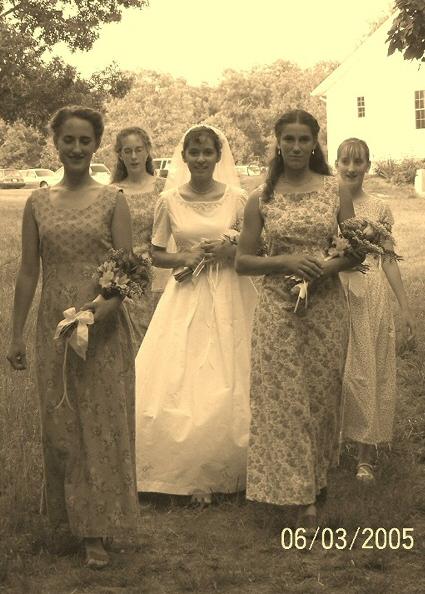 Maybe I got the idea from my sister-in-law's wedding. When she was married, we bridesmaids didn't go before her. We escorted her down. There were four of us, two went ahead and two went behind. (See picture if you want a visual explanation.)