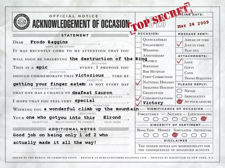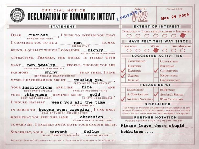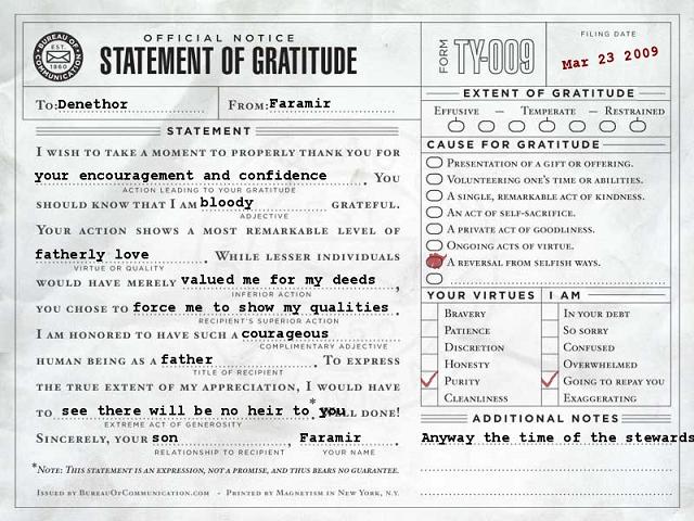 Through my mad Webtrawling skillz I discovered this site, which allows one to fill out some limited form correspondence. Seeing it implemented in other fandoms, I immediately thought of various Tolkien characters using this method to express their desires, regrets, etc. With that in mind, please accept these humble submissions to the realm of Mirth and, if the notion please you, continue in the tradition by submitting your own. Canonical errors are mine; errors in humor are the reader's.