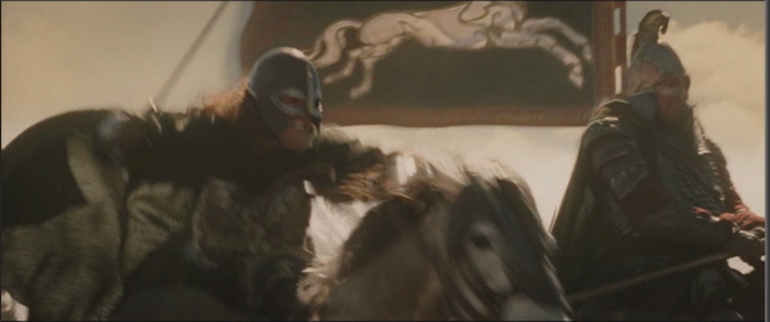 Now I see what you mean, as I saw angry riders with swords, but not axes. While watching the scene again, I noticed how some of the spears wiggle when the Riders ride.