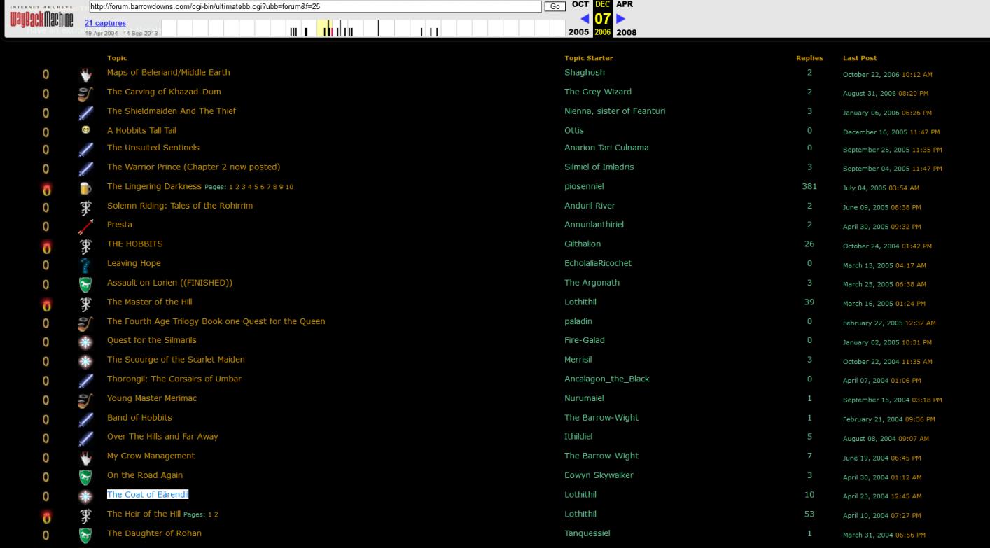 Many of the larger fan fiction threads are still accessible with this tool and theres probably a bunch of other stuff that is recoverable with this that might otherwise be lost. I am not sure if there is already an archive here that I missed? Perhaps this thread is redundant. Anyway I thought someone might enjoy the nostalgia this might provide. https://web.archive.org/web/20080415...arrowdowns.com