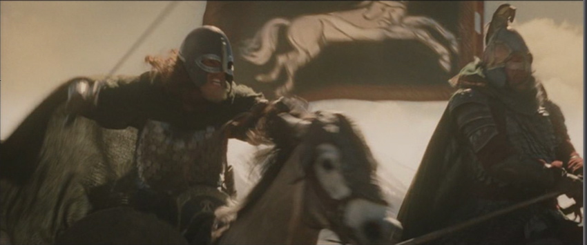 Now I see what you mean, as I saw angry riders with swords, but not axes. While watching the scene again, I noticed how some of the spears wiggle when the Riders ride.