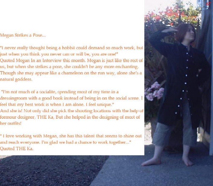 This project of mine really started about a month ago... My dear friend Megan Le Boogerbeans has always had this dream to be a hobbit. Well, this month for one day i took her on a sort of "becoming a hobbit" trip, just around Northwestern Washington (Where we live). Along the trip she wanted me to take pictures of her poseing in different select locations. In other words, I was her fashion designer/photographer for the whole day. As i was loading these pictures up onto my computer, i got an idea. We have Vogue, Why not make a Hobbit version? I really don't follow fashion at all, (I'm still in the 80's), But for this purpose, i decided to care alittle bit. I went out and did some research (Something i do best), and when i was done, Walla! I give you Hogue! So read and enjoy!