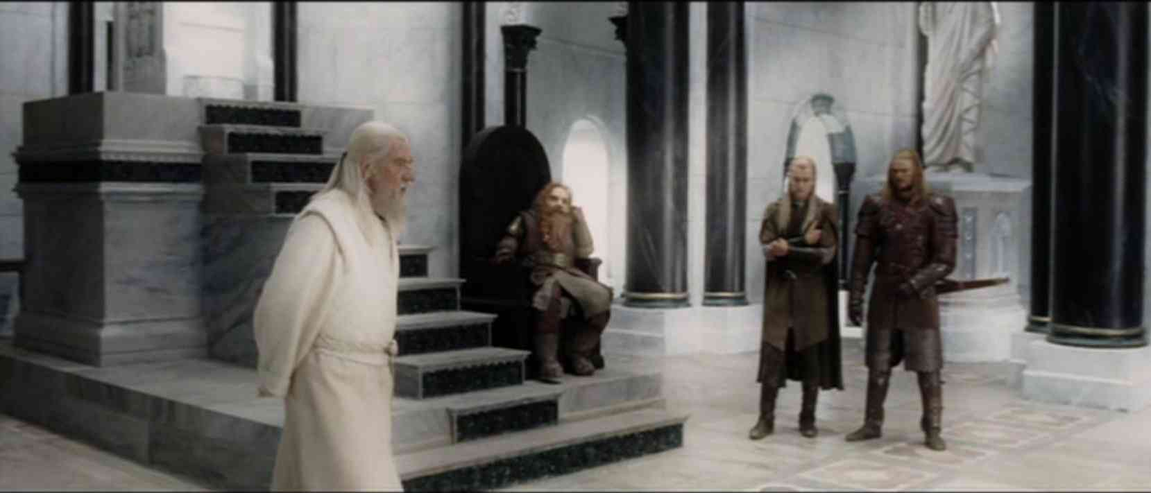 ![]() Anyway, now I do have some 'evidence' as to why I think that Gimli shouldn't have stood on the Tomb of Balin. I'll disregard the whole 'respect' thing as I don't know that much about movie Dwarven culture. Sure, Gimli spends a lot of time kneeling before the tomb, but then maybe all bets are off once the Dwarf's blood (if they have blood, which is another assumption) gets hot. I'll be referring to the attached images. In 'Gimli,' we see the Dwarf atop the tomb. Aragorn and Legolas - archers - are in front, and Boromir stands out there as well with sword and shield. Gandalf and the hobbits stand off to the other side. Gimli2 shows this from the front - what the orcs will see when they enter the Chamber of Mazarbul. Gimli3 shows Gimli after the affray has gone on for a few minutes. The Dwarf is still atop the tomb. Aragorn has switched from bow to sword, and at this time everyone is engaged. Gimli has taken one or possibly two hacks at orcs, and now is dodging the troll's attack. Okay, so for me, I would say that this 'come and get some' Dwarf would have been better positioned for battle directly in front of the tomb. You'll notice if you watch the scene that his 'count,' which becomes more important later, is slightly - if at all - above the individual hobbits. He could have been right behind Aragorn and Legolas, so that when they drop their bows he could add to the ground attack. But... And now for the Seat of Denethor. In Gimli4, we can see the Dwarf happily planted on the black throne. Please look closely at his legs and his head in relationship to the throne. In Gimli5, we see that the Dwarf is so comfortable that he's lit up his pipe - hammer and tongs! Now I will conjecture that all of this fuss about disrespect for the Seat of Denethor is for not. Why? Again, look at Gimli4. If that's a human-sized throne then I'll be a winged polar Balrog. So, my conclusion? The Army of the Dead stole the real throne and replaced it with the one we see. You also will note that the King's throne also is missing.No wonder they were in a hurry to leave on the Pellenor Fields - had to get out of town before Aragorn discovered their prank. Aragorn cares not as he sees the obvious fakery. How else can you explain it?