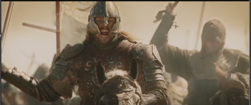 New here and ready to make some friends that share my love for LOTR. I am currently looking to do a drawing of one of the Rohirrim. It is a specific one. In ROTK, during the charge of Pelennor Fields where they are riding straight into the orcs. There is one rider who is bent low on his horse, clenching his axe in one hand and gripping the reigns with a P.O.ed look on his face, riding as fast as his horse can. It is a shot looking at him from the side. Currently I only have my laptop and I have not got the codec to watch movies on it, so I cannot get a screenshot of this. Anyone who knows where to find this picture or take it themselves, I give many thanks too. This is one of my favorite parts of the trilogy and that scene gives me a lot of inspiration for my artwork. And again, glad to be here! -Fenris Note: I also believe that that certain shot if after the orc leader yells "Fire at will!"