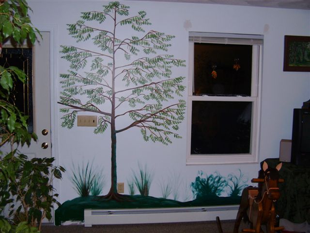 They looked better bare then partly covered with sparse leaves! I've taken pictures... (pause) The first two pictures show with recently added new leaves (sparse because the stencil paint dries SO SLOWLY!!!), the last two pictures were the original bare trees. I almost like bare better...