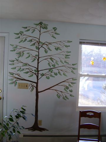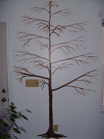 They looked better bare then partly covered with sparse leaves! I've taken pictures... (pause) The first two pictures show with recently added new leaves (sparse because the stencil paint dries SO SLOWLY!!!), the last two pictures were the original bare trees. I almost like bare better...