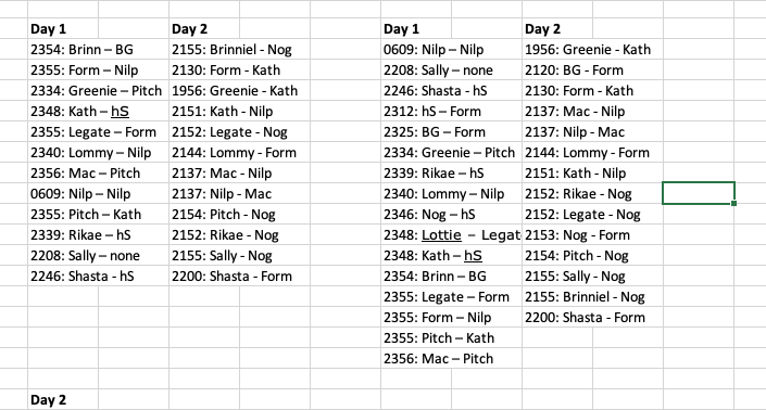 I would like to point out that Rikae voted for both hS and Nog and both of them ended up lynched. Rikae was also the second person to vote for hS (Shasta was the first) and the first person to vote for Nog: Day 1 2354: Brinn – BG 2355: Form – Nilp 2334: Greenie – Pitch 2348: Kath –hS 2355: Legate – Form 2340: Lommy – Nilp 2356: Mac – Pitch 0609: Nilp – Nilp 2355: Pitch – Kath 2339: Rikae – hS 2208: Sally – none 2246: Shasta - hS Day 2 2155: Brinniel - Nog 2130: Form - Kath 1956: Greenie - Kath 2151: Kath - Nilp 2152: Legate - Nog 2144: Lommy - Form 2137: Mac - Nilp 2137: Nilp - Mac 2154: Pitch - Nog 2152: Rikae - Nog 2155: Sally - Nog 2200: Shasta - Form Attachment is LEFT: data in order by name. RIGHT: order by time.