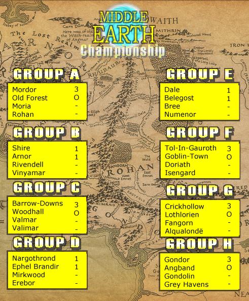 Out of pure bordem I have decided to do a Middle-Earth Football Tournament. It will be done World Cup style. 8 Groups, 4 Teams in each. Top two will move on to the Quarter-Finals and from there on it will be in knock-out format.