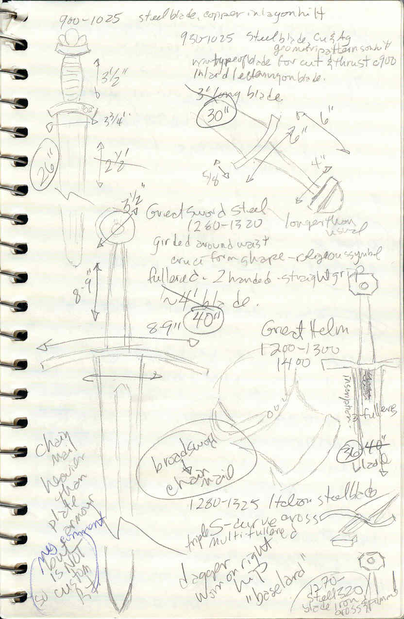 ~ June 1, 2002 Thanks for starting this thread on swordfighting. The info is very helpful. Sorry to divert the topic to weapon design, but form follows function, eh? I decided to go to the local museum (the ROM - Royal Ontario Museum) the other day to revisit their display of weapons and armour. Got a better idea of size and scale of the swords and the component parts. Two broadswords dated 900-1025 AD had blades about 30" and 36" with grips 4" and 6" respectively. The second, longer sword was a 'new type of blade for cut & thrust c. 900 AD'. So I assume these were used one-handed? (Sorry, they didn't give dimensions, so these are my estimates.) They had one Great Sword (2-hander) dated 1280-1320 AD and the blade appeared to be about 48", which they described as 'longer than usual'. The grip was about 8" or 9", as was the guard (or cross). There were two hand-and-a-half swords, one from 1350-1400 AD - 'long, stiff, sharply pointed steel blade useful for thrusting'. Grip approx. 6"-7". The other dated 1300-1350 AD had a blade with 'a more acute point and thicker cross-section for thrusting and cutting'. These swords brought about the beginning of the end of chain-mail since the sharp points could 'pop' the mail rings when thrusting. Partial plate armour began about 1200 AD. Looking forward to more swordfighting lessons! ~ August 9, 2002 Hi Marileangorifurnimaluim! UPDATE/CORRECTIONS to Sword info: My previous visit to the ROM was about 20 minutes, I stopped in between appointments, so I was a bit rushed. I've since gone back and spent more than an hour carefully examining and sketching the swords and armour. I even took a tape measure to get more accurate dimensions. (Even so, it's difficult to measure articles that are two feet behind glass.) The two broadswords dated 900-1025 AD had blades about 26" and 30". The blade of the Great Sword (2-hander) dated 1280-1320 AD was closer to 40" to perhaps 44" rather than 48" I previously estimated. Still it was described as 'longer than usual' and was the same length as the approx. 42"-44" blade of a Scottish Claymore dated early 1500s. The notes in the display claimed that the claymore was similar to two-handed swords used in Central Europe but it had a slightly shorter blade and angled guards. (The claymore had a 10-12" two-handed grip.) So I'm guessing that a 48" Great Sword is not out of the question. The blade of the hand-and-a-half sword from 1350-1400 AD was about 36" and the grip was closer to 8" or 9". Cross sections for cutting swords are: <=> or <x> (flat with sharp edges or fullered with tapered sharp edges) Cross sections for cut & thrust swords are: <0> or ^ or <> (thicker center with tapered sharp edges or triangular or diamond-shaped) Average weight/mass of a sword was only 2-3 lb or 0.9-1.4 kg!!! NOT Swords: Full suit of plate armour massed/weighed about 18-27 kg or 40-60 lb. That’s no heavier than field packs carried by infantry in World War I. There was a buckler on display. That's a small shield used in foot combat 1200s-1600. Some were round, others rectangular. This one was round from Wales, used in the early 1500s, about 12" in diameter. It was made of concentric rings of rivets and had a 2" globe-shaped boss or finial at the center. The overall shape of the shield was like a straw hat with an upturned brim (with the boss on top). That is concave from the outer edge inverting to convex at the center. This shape boggled my mind – not at all what I expected. I expected a convex shape that sort of wraps around the arm/body. An example of an Italian Barbut c. 1460 - a light helmet (shoulder length) with t-shape opening in front for vision and ventilation was 5 ½ lb or 2.5 kg. The smooth round surfaces of this plate-metal helmet deflected the most powerful personal weapons of the day. I've got some more info on spurs and sword-making and sword decoration (blueing, fire-guilding, etching, engraving, chiselling, chasing/embossing), but I'm a bit fuzzy on it. ~ And here I'm attaching my sketches & notes of weapons & armour from my visits to the ROM (Royal Ontario Museum) in 2002. A picture is worth a thousand words. Pages 1, 5, 6, & 7 of total 7 attached. Oops! File size limit is 100 KB and I pages 2, 3 & 4 are larger than that. Working on new drawings since original sketches are very rough. Will upload later .