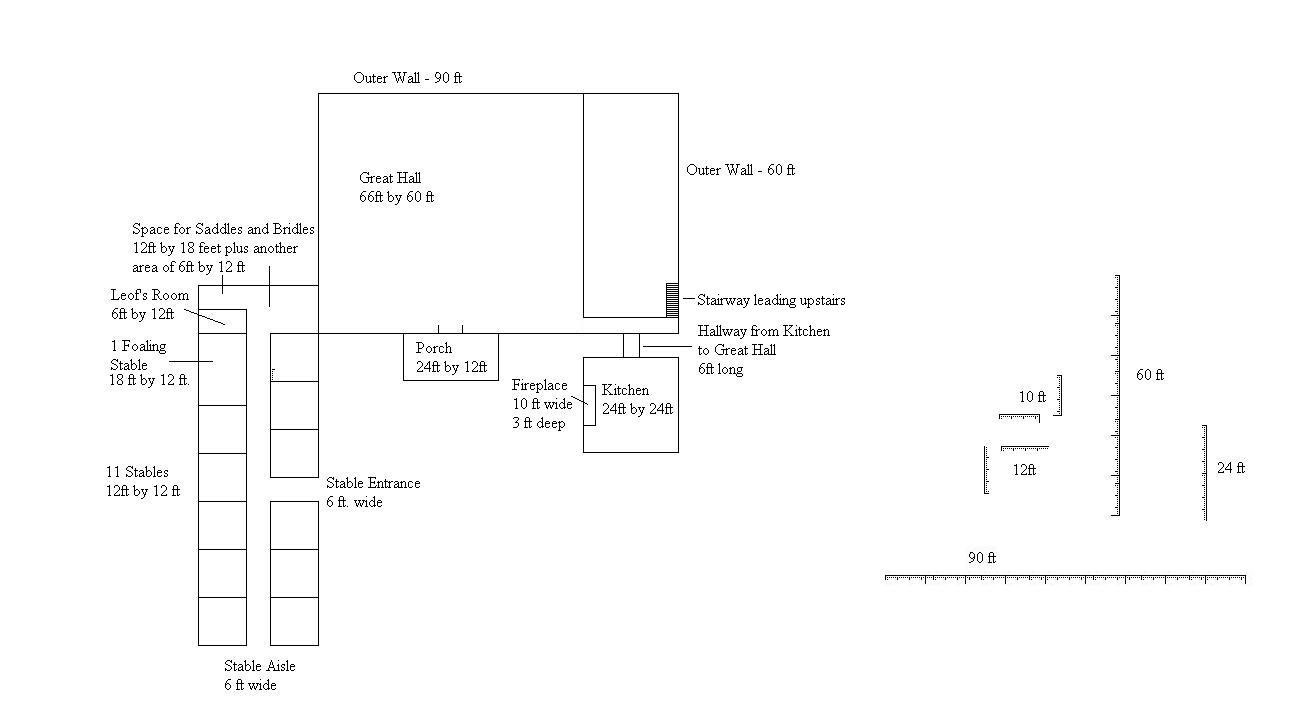Anyone from Europe, please forgive the fact that I have used the standard American measurement - the foot. A foot is about 30.5 centimeters. What you see is the lower storey of the building. As you can see, there is a lot of extra room across from the kitchen. I was thinking of putting an armory and the room for all the men-at-arms to sleep in that space. I was also thinking of having the kitchen ladies sleep downstairs as well, but I don't know if there's room for all that. Let me know your thoughts. Another thing that I'm concerned about is that I may have made everything too small. Please give me your input. I'm bad at picturing big things. -- Foley