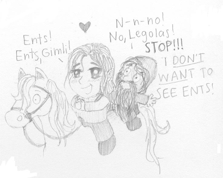 Here is something I drew a while ago, based on a part from The Two Towers, when Gandlaf and Co. rode out of Fangorn on their way to Isengard, but Legolas saw something back in the trees...