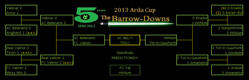 GK Tar-Atanamir (Armenelos) DF *Tilion (Real Val) DF GaladriWight (TIG) DF Balrog#5 (Hithlum) DF Estë (Valimar) MF Tar-Míriel (Armenelos) MF *Ingwë (Valimar) MF *Glorfindel (Eriador) FW *Glaurung (Nargothrond) FW *Ancalagon (Angband) FW *Arien (Valimar) -> C --GaladriWight --Glaurung --Ancalagon ++DF Balrog #4 (AC Bel) ++okay, okay, FW *Curufin. Sheesh. (FC Val) ++FW **Fëanor (AC Bel) So, we get: SALT AND SMOKE GK Tar-Atanamir (Armenelos) DF *Tilion (Real Val) DF Balrog#4 (AC Bel) DF Balrog#5 (Hithlum) DF Estë (Valimar) MF Tar-Míriel (Armenelos) MF *Ingwë (Valimar) MF *Glorfindel (Eriador) FW *Curufin (FC Val) FW **Fëanor (AC Bel) FW *Arien (Valimar) -> C Predictions: AC Bel vs Valimar Real Val vs FC Val Eriador vs Hithlum Armenelos vs TIG |