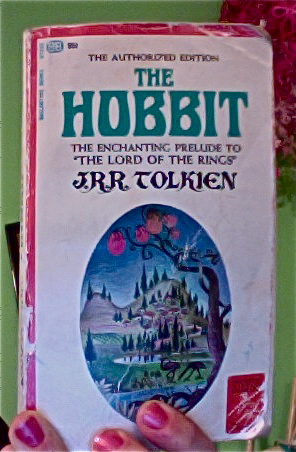 My latest acquisitions to add to my Tolkien Spoils collection (which alas, is pitifully small) are my One Ring, which TheGreatElvenWarrior gave to me as a birthday present (really! She did, I swears it!) and which I now wear almost everyday, and my vintage edition of The Hobbit, which I got from my English teacher in exchange for another, less-good book. The reason I wanted that particular copy of The Hobbit so much is because of its cover art--my mother had a poster of that drawing back in the '60s when she was a dirt-poor hippie living in a one-room cabin without running water. Life was made bearable by the presence of this great work of art!