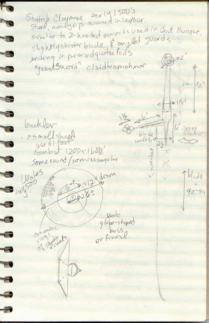 ~ June 1, 2002 Thanks for starting this thread on swordfighting. The info is very helpful. Sorry to divert the topic to weapon design, but form follows function, eh? I decided to go to the local museum (the ROM - Royal Ontario Museum) the other day to revisit their display of weapons and armour. Got a better idea of size and scale of the swords and the component parts. Two broadswords dated 900-1025 AD had blades about 30" and 36" with grips 4" and 6" respectively. The second, longer sword was a 'new type of blade for cut & thrust c. 900 AD'. So I assume these were used one-handed? (Sorry, they didn't give dimensions, so these are my estimates.) They had one Great Sword (2-hander) dated 1280-1320 AD and the blade appeared to be about 48", which they described as 'longer than usual'. The grip was about 8" or 9", as was the guard (or cross). There were two hand-and-a-half swords, one from 1350-1400 AD - 'long, stiff, sharply pointed steel blade useful for thrusting'. Grip approx. 6"-7". The other dated 1300-1350 AD had a blade with 'a more acute point and thicker cross-section for thrusting and cutting'. These swords brought about the beginning of the end of chain-mail since the sharp points could 'pop' the mail rings when thrusting. Partial plate armour began about 1200 AD. Looking forward to more swordfighting lessons! ~ August 9, 2002 Hi Marileangorifurnimaluim! UPDATE/CORRECTIONS to Sword info: My previous visit to the ROM was about 20 minutes, I stopped in between appointments, so I was a bit rushed. I've since gone back and spent more than an hour carefully examining and sketching the swords and armour. I even took a tape measure to get more accurate dimensions. (Even so, it's difficult to measure articles that are two feet behind glass.) The two broadswords dated 900-1025 AD had blades about 26" and 30". The blade of the Great Sword (2-hander) dated 1280-1320 AD was closer to 40" to perhaps 44" rather than 48" I previously estimated. Still it was described as 'longer than usual' and was the same length as the approx. 42"-44" blade of a Scottish Claymore dated early 1500s. The notes in the display claimed that the claymore was similar to two-handed swords used in Central Europe but it had a slightly shorter blade and angled guards. (The claymore had a 10-12" two-handed grip.) So I'm guessing that a 48" Great Sword is not out of the question. The blade of the hand-and-a-half sword from 1350-1400 AD was about 36" and the grip was closer to 8" or 9". Cross sections for cutting swords are: <=> or <x> (flat with sharp edges or fullered with tapered sharp edges) Cross sections for cut & thrust swords are: <0> or ^ or <> (thicker center with tapered sharp edges or triangular or diamond-shaped) Average weight/mass of a sword was only 2-3 lb or 0.9-1.4 kg!!! NOT Swords: Full suit of plate armour massed/weighed about 18-27 kg or 40-60 lb. That’s no heavier than field packs carried by infantry in World War I. There was a buckler on display. That's a small shield used in foot combat 1200s-1600. Some were round, others rectangular. This one was round from Wales, used in the early 1500s, about 12" in diameter. It was made of concentric rings of rivets and had a 2" globe-shaped boss or finial at the center. The overall shape of the shield was like a straw hat with an upturned brim (with the boss on top). That is concave from the outer edge inverting to convex at the center. This shape boggled my mind – not at all what I expected. I expected a convex shape that sort of wraps around the arm/body. An example of an Italian Barbut c. 1460 - a light helmet (shoulder length) with t-shape opening in front for vision and ventilation was 5 ½ lb or 2.5 kg. The smooth round surfaces of this plate-metal helmet deflected the most powerful personal weapons of the day. I've got some more info on spurs and sword-making and sword decoration (blueing, fire-guilding, etching, engraving, chiselling, chasing/embossing), but I'm a bit fuzzy on it. ~ And here I'm attaching my sketches & notes of weapons & armour from my visits to the ROM (Royal Ontario Museum) in 2002. A picture is worth a thousand words. Pages 1, 5, 6, & 7 of total 7 attached. Oops! File size limit is 100 KB and I pages 2, 3 & 4 are larger than that. Working on new drawings since original sketches are very rough. Will upload later .