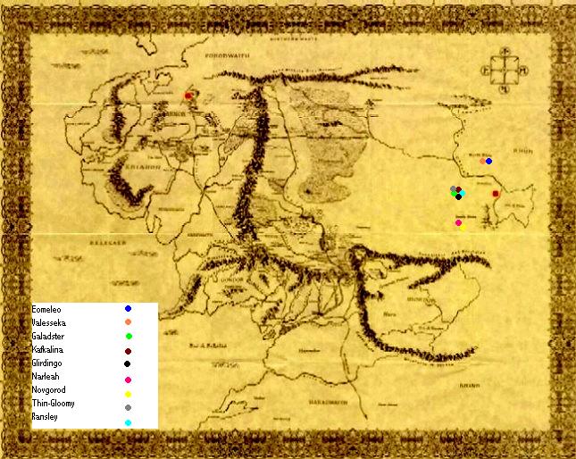 Eomeleo Race-Human Location-Gondor Weapons- Sword/Crossbow Novelty- Golden Ocarina on chain Clothes- Shirt, jacket, waistcoat, ruffled shirt, a splendid feathered hat.(all royal blue) Valesseka Race-Human Location-Arnor Weapons-Throwing axe/ Stave Novelty-Brooch Clothes-wool and leather travelling clothes Galadster Race-Human Location-Rhun Weapons- Scimitar/Short bow and quiver Novelty-Rat tail Clothes-Tunic and Robe Kafkalina Race-Ent Location-North edge of the Old forest, East side of the Brandywine river Weapons-Strength and height (body) Novelty-Mallorn seeds Clothing-Green leaves/ Autumn leaves Glirdingo Race-Elf Location-Lorien Weapons-Bow and quiver/Short sword Novelty-Walking stick Clothes- Deep green camouflaged clothes and a grey Elven cloak held on by a mallorn leaf pin. Narleah Race- SheDwarf Location-Misty Mountains Weapons- Mace/ Hatchet Novelty-Over sized floppy leather hat Clothes-Long leather jerkin, Wool coat Novgorod Race-human Location-Dale Weapons-13 Darts/beautiful Easterling Sword Novelty-Tinderbox Clothes-Cotton pants, red and yellow silk shirts, scarf embroidered with silver thread Thin-Gloomy Race-Dwarf Location-Iron Hills Weapons-Crossbow 10 arrows/Big knife Novelty-Tinderbox Clothes-Badly made brown traveling clothes Ransley Race-Human Location-Arnor Weapons-Long sword with a black streak down the middle/Silver plated short sword. Novelty-Thick metal sheet 15x17 inchs Clothes-Brown pants, brown boots,grey shirt, leather tunic, grey cloak,long grey robes Day 1 has now begun. All players please pm your direction choice to me. Left, right or Straight .....You have 36hrs to complete your post.